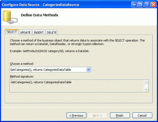 To have this ObjectDataSource return all of the categories, bind it to the CategoriesBLL class’s GetCategories() method.