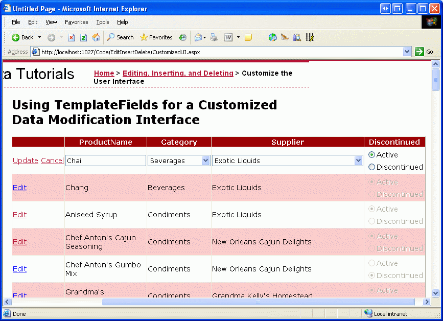 Currently the products’ Discontinued data field is expressed using a CheckBoxField, which renders a disabled checkbox for the read-only rows and an enabled checkbox for the row being edited. While this user interface is often suitable, we can customize it if needed using a TemplateField. For this tutorial, let’s change the CheckBoxField into a TemplateField that uses a RadioButtonList control with two options “Active” and “Discontinued” from which the user can specify the product’s Discontinued value.