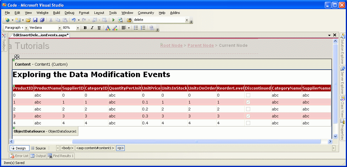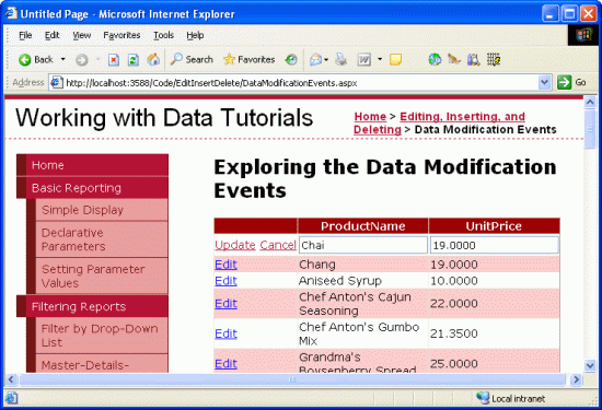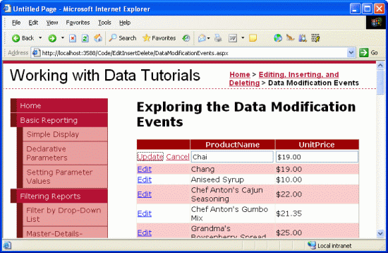 In this tutorial we’ll examine using these events to extend the built-in inserting, updating, and deleting capabilities of the ASP.NET data Web controls. We’ll also see how to customize the editing interface to only update a subset of the product fields.