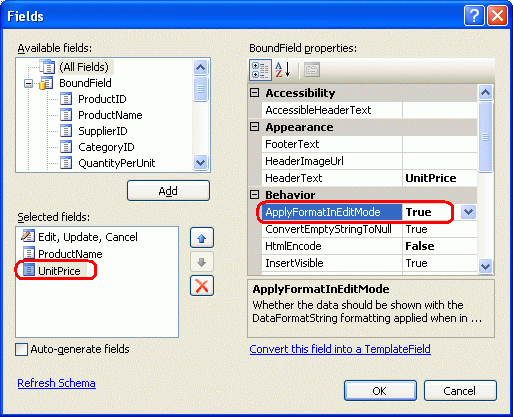 Figure 9: Set the UnitPrice BoundField’s ApplyFormatInEditMode property to true (Click to view full-size image)