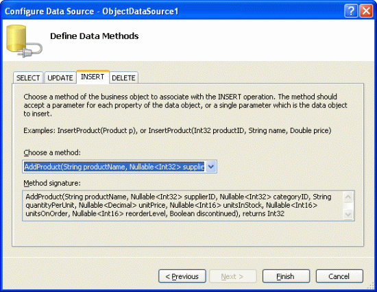 Leave the Insert() method pointing to the AddProduct method, but again set the DELETE tab’s drop-down list to (None).