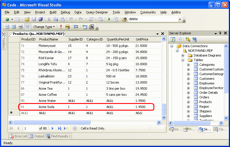 While the GridView in Figure 18 doesn’t show it, the product fields lacking from the DetailsView interface CategoryID, SupplierID, QuantityPerUnit, and so on are assigned NULL database values. You can see this by performing the following steps: