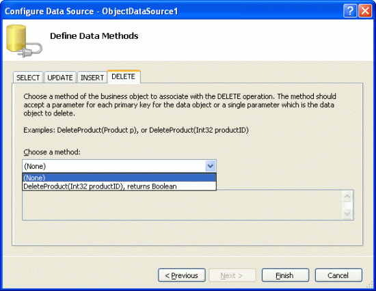 Since our example will initially just need the ability to edit data, but not to insert or delete records, take a moment to explicitly indicate that the ObjectDataSource’s Insert() and Delete() methods shouldn’t be mapped to any of the ProductsBLL class’s methods by going to the INSERT and DELETE tabs and choosing (None) from the drop-down list.