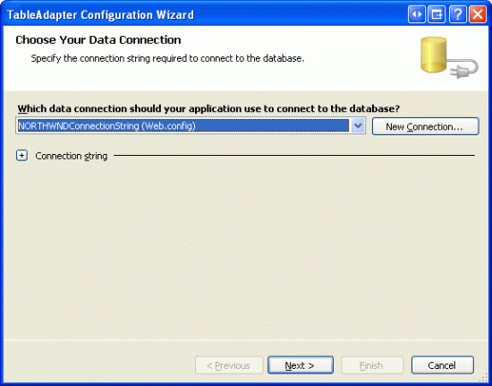 To create a new Typed DataSet, right-click on the DAL folder within the App_Code folder and add a new DataSet named NorthwindOptimisticConcurrency. As we saw in the first tutorial, doing so will add a new TableAdapter to the Typed DataSet, automatically launching the TableAdapter Configuration Wizard. In the first screen, we’re prompted to specify the database to connect to - connect to the same Northwind database using the NORTHWNDConnectionString setting from Web.config.