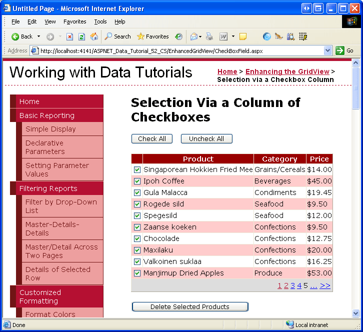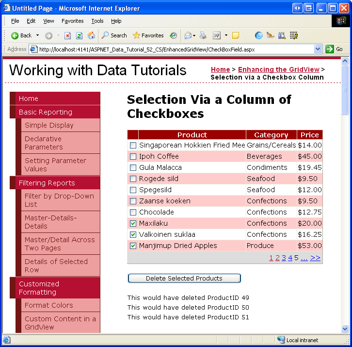 In this tutorial we will see how to add a column of checkboxes and how to determine what checkboxes were checked on postback. In particular, we’ll build an example that closely mimics the web-based email client user interface. Our example will include a paged GridView listing the products in the Products database table with a checkbox in each row (see Figure 1). A Delete Selected Products button, when clicked, will delete those products selected.
