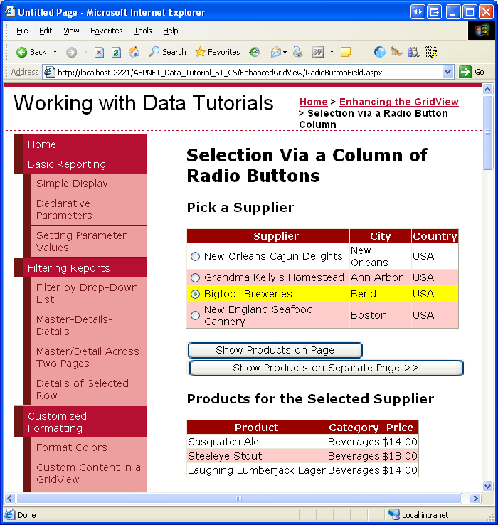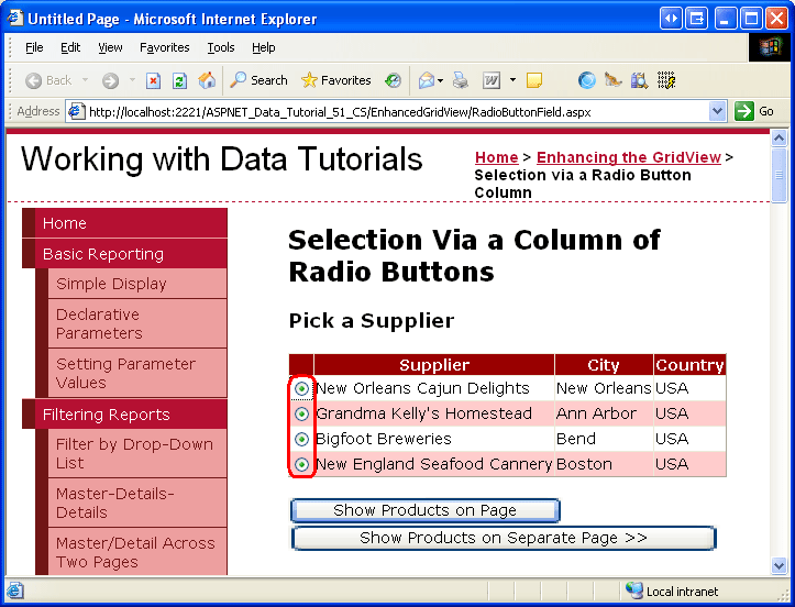 At this point we have added a column of grouped radio buttons to the GridView that allows for a single GridView row to be selected and remembered across postbacks. Our next steps are to display the products provided by the selected supplier. In Step 4 we’ll see how to redirect the user to another page, sending along the selected SupplierID. In Step 5, we’ll see how to display the selected supplier s products in a GridView on the same page.