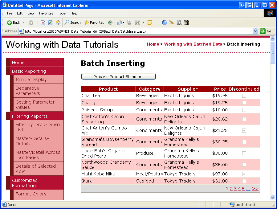 Take a moment to view our progress through a browser. As Figure 5 shows, you should see a Process Product Shipment button above a GridView that lists the products ten at a time.