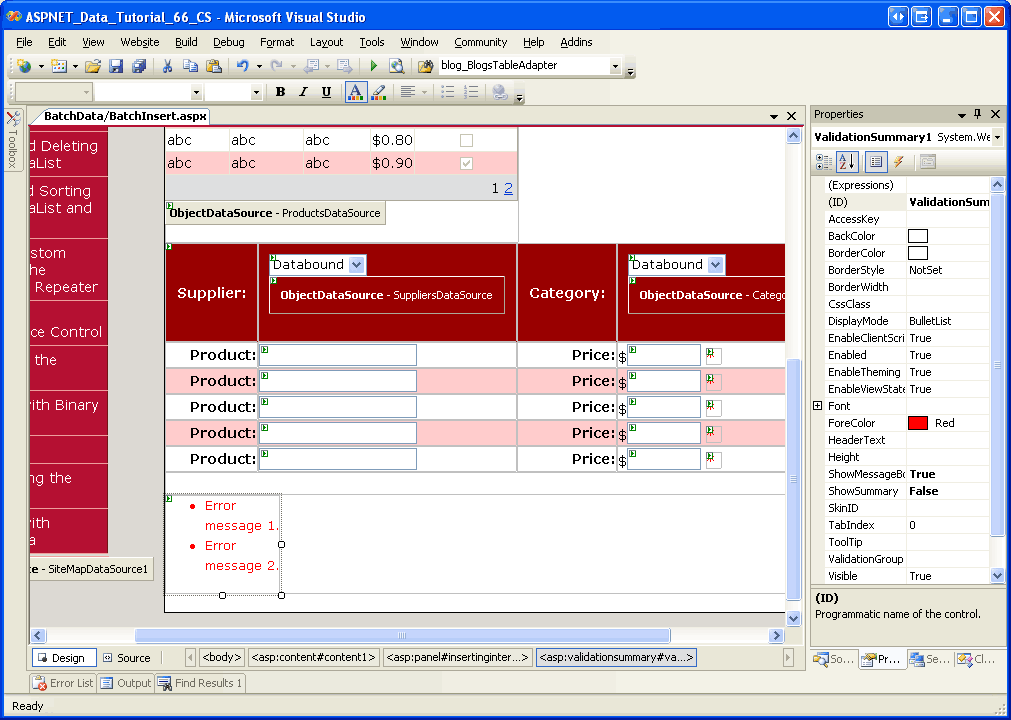With a little work we can create a batch inserting interface that enables the user to choose the supplier and category once, enter a series of product names and unit prices, and then click a button to add the new products to the database (see Figure 1). As each product is added, its ProductName and UnitPrice data fields are assigned the values entered in the TextBoxes, while its CategoryID and SupplierID values are assigned the values from the DropDownLists at the top fo the form. The Discontinued and UnitsOnOrder values are set to the hard-coded values of false and 0, respectively.
