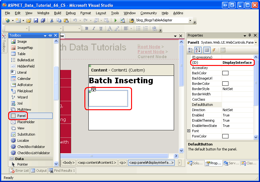 Start by opening the BatchInsert.aspx page in the BatchData folder and drag a Panel from the Toolbox onto the Designer (see Figure 2). Set the Panel s ID property to DisplayInterface. When adding the Panel to the Designer, its Height and Width properties are set to 50px and 125px, respectively. Clear out these property values from the Properties window.