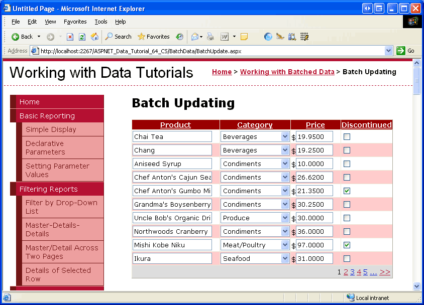 Take a minute to test out this code. Visit BatchUpdate.aspx through a browser, edit a number of rows, and click one of the Update Products buttons. Assuming there are no input validation errors, you should see a messagebox that reads The products have been updated. To verify the atomicity of the update, consider adding a random CHECK constraint, like one that disallows UnitPrice values of 1234.56. Then from BatchUpdate.aspx, edit a number of records, making sure to set one of the product s UnitPrice value to the forbidden value ( 1234.56 ). This should result in an error when clicking Update Products with the other changes during that batch operation rolled back to their original values.