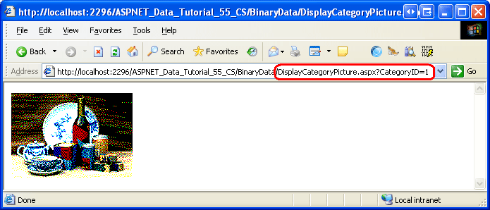 Let s augment the Categories GridView in DisplayOrDownloadData.aspx by adding an ImageField to show each category s picture. Simply add the ImageField and set its DataImageUrlField and DataImageUrlFormatString properties to CategoryID and DisplayCategoryPicture.aspx?CategoryID={0}, respectively. This will create a GridView column that renders an <img> element whose src attribute references DisplayCategoryPicture.aspx?CategoryID={0}, where {0} is replaced with the GridView row s CategoryID value.
