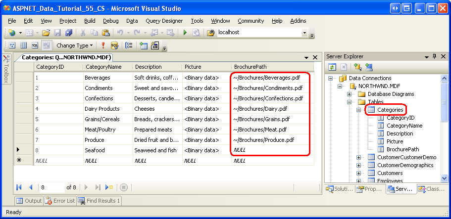 In this tutorial s download you’ll find seven PDF brochure files in the ~/Brochures folder, one for each of the categories except Seafood. I purposefully omitted adding a Seafood brochure to illustrate how to handle scenarios where not all records have associated binary data. To update the Categories table with these values, right-click on the Categories node from Server Explorer and choose Show Table Data. Then, enter the virtual paths to the brochure files for each category that has a brochure, as Figure 1 shows. Since there is no brochure for the Seafood category, leave its BrochurePath column s value as NULL.