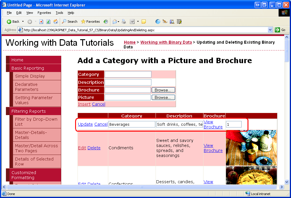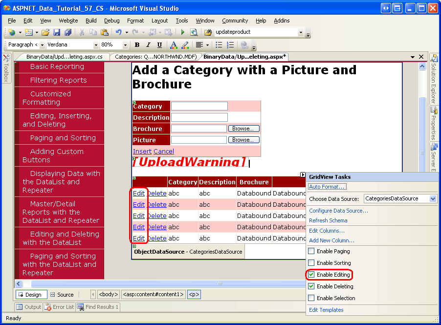 In the preceding tutorial we created a page named UploadInDetailsView.aspx that listed all categories in a GridView and provided a DetailsView to add new categories to the system. In this tutorial we will extend the GridView to include editing and deleting support. Rather than continuing to work from UploadInDetailsView.aspx, let s instead place this tutorial s changes in the UpdatingAndDeleting.aspx page from the same folder, ~/BinaryData. Copy and paste the declarative markup and code from UploadInDetailsView.aspx to UpdatingAndDeleting.aspx.