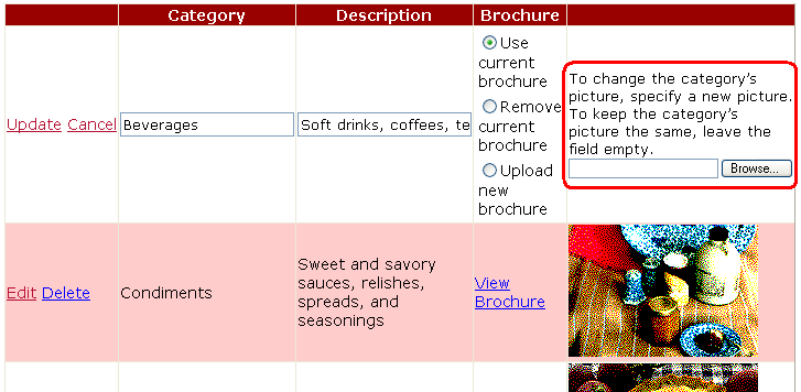 With this code in place, you can edit a category and have it use its current brochure, use no brochure, or upload a new one. Go ahead and try it out. Set breakpoints in the RowUpdating and RowUpdated event handlers to get a sense of the workflow.