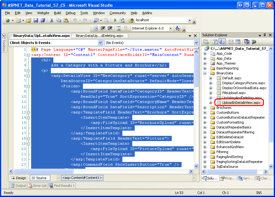 Figure 3: Copy the Declarative Markup from UploadInDetailsView.aspx (Click to view full-size image)