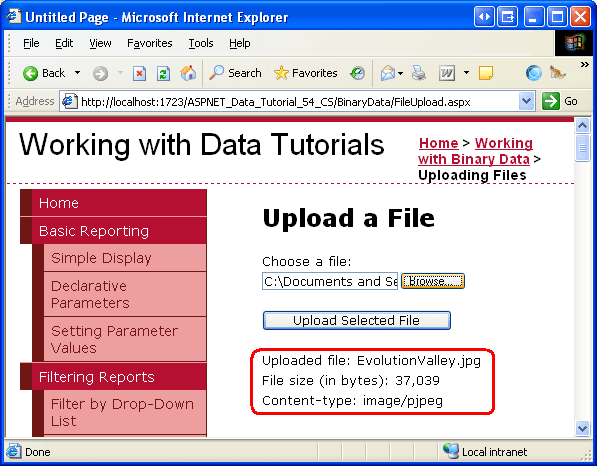 Figure 13 shows this page when viewed through a browser. Note that clicking the Browse button brings up a file selection dialog box, allowing the user to pick a file from their computer. Once a file has been selected, clicking the Upload Selected File button causes a postback that sends the selected file s binary content to the web server.
