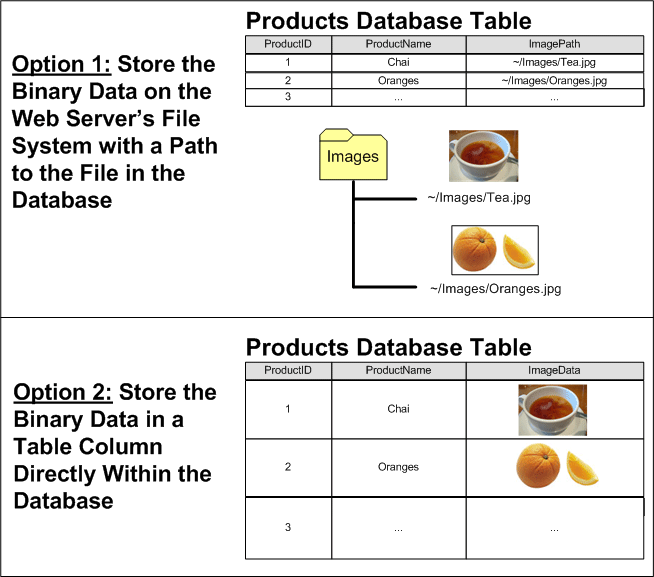 Imagine that we wanted to extend the Northwind database to associate a picture with each product. One option would be to store these image files on the web server s file system and record the path in the Products table. With this approach, we d add an ImagePath column to the Products table of type varchar(200), perhaps. When a user uploaded a picture for Chai, that picture might be stored on the web server s file system at ~/Images/Tea.jpg, where ~ represents the application s physical path. That is, if the web site is rooted at the physical path C:\Websites\Northwind\, ~/Images/Tea.jpg would be equivalent to C:\Websites\Northwind\Images\Tea.jpg. After uploading the image file, we d update the Chai record in the Products table so that its ImagePath column referenced the path of the new image. We could use ~/Images/Tea.jpg or just Tea.jpg if we decided that all product images would be placed in the application s Images folder.