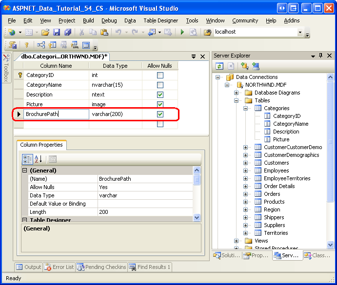 Add a new varchar(200) column to the Categories table that is named BrochurePath and allows NULL s and click the Save icon (or hit Ctrl+S).