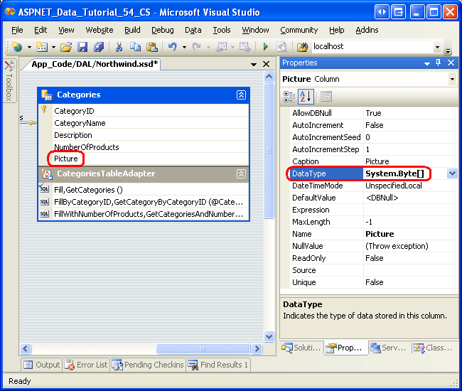 Notice that none of these queries return the Categories table s Picture or BrochurePath columns; nor does the CategoriesDataTable provide DataColumn s for these fields. In order to work with the Picture and BrochurePath properties, we need to first add them to the CategoriesDataTable and then update the CategoriesTableAdapter class to return these columns.