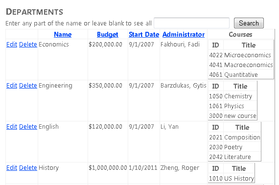 This tutorial series builds on the Contoso University web application that is created by the Getting Started with the Entity Framework 4.0 tutorial series. If you didn’t complete the earlier tutorials, as a starting point for this tutorial you can download the application that you would have created. You can also download the application that is created by the complete tutorial series. If you have questions about the tutorials, you can post them to the ASP.NET Entity Framework forum.