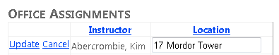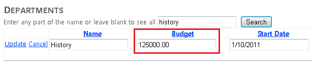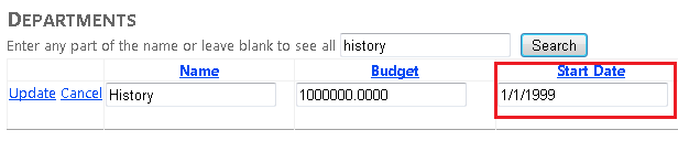 Before John clicks Update, Jane runs the same page, clicks the Edit link for the History department, and then changes the Start Date field from 1/10/2011 to 1/1/1999. (Jane administers the History department and wants to give it more seniority.)