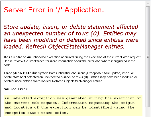 Run the page and create a concurrency conflict again. This time you see an error message: