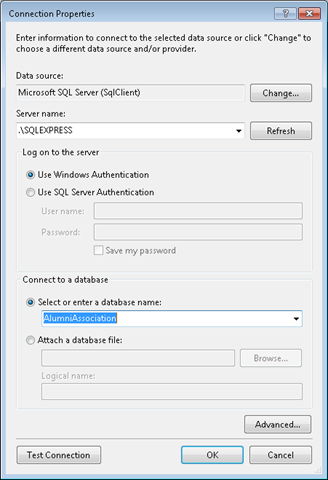 In the Connection Properties dialog box, select the local SQL Server Express instance and name the database AlumniAsssociation.