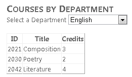 This code executes the SQL Update command using the value in the text box and uses the label to display the number of rows affected. Before you run the page, run the Courses.aspx page to get a “before” picture of some data.