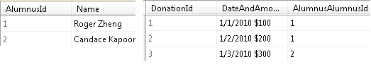 Using Server Explorer, add the following rows to the Alumnus and Donation tables.