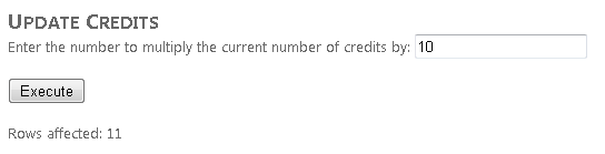 Run UpdateCredits.aspx, enter “10” as the multiplier, and then click Execute.