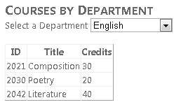 Suppose Contoso University administrators want to be able to perform bulk changes in the database without having to go through the process of creating a stored procedure and importing it into the data model. Their first request is for a page that lets them change the number of credits for all courses in the database. On the web page, they want to be able to enter a number to use to multiply the value of every Course row’s Credits column.