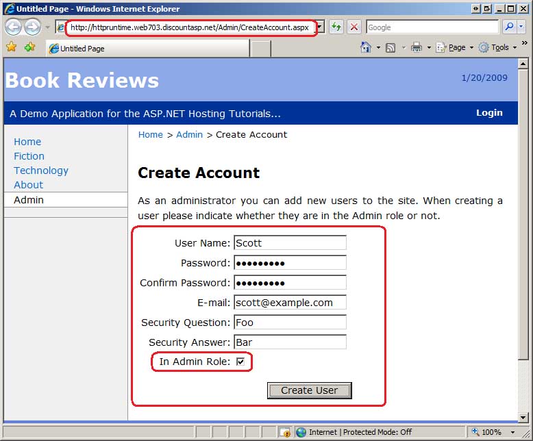 Over the past couple tutorials the Book Reviews web application was updated from a static website to a dynamic, data-driven web application complete with a set of administration pages for managing genres and reviews. However, this administration section is currently not protected - any user who knows (or guesses) the administration page URL can waltz in and create, edit, or delete reviews on our site. A common way to protect certain portions of a website is to implement user accounts and then use URL authorization rules to restrict access to certain users or roles. The Book Reviews web application available for download with this tutorial supports user accounts and roles. It has a single role defined named Admin and only users in this role can access the administration pages.
