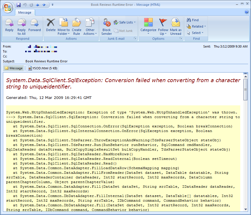 With the above settings in place, whenever a runtime error occurs ELMAH sends an e-mail to support@example.com with the error details. ELMAH’s error e-mail includes the same information shown in the error details web page, namely the error message, the stack trace, and the server variables (refer back to Figures 4 and 5). The error e-mail also includes the Exception Details Yellow Screen of Death content as an attachment (YSOD.html).