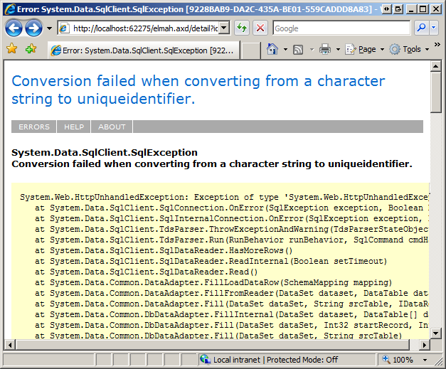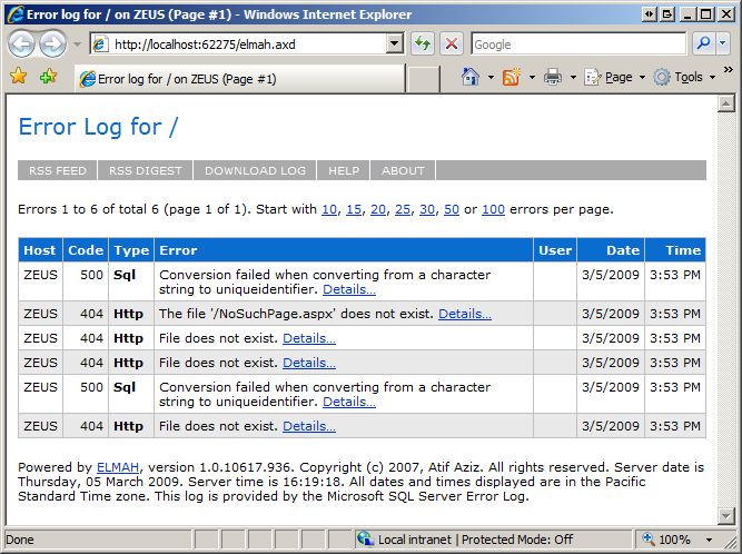Figure 3: Elmah.axd Displays the Error Log from a Web Page