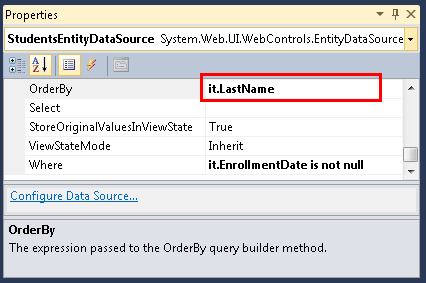 You also want this list to be in name order when it’s first displayed. With the Students.aspx page still open in Design view, and with the EntityDataSource control still selected, in the Properties window set the OrderBy property to it.LastName.