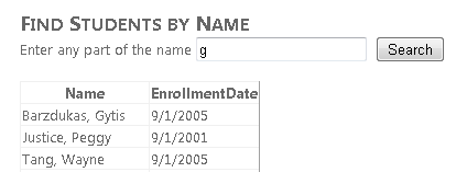 Enter the letter “g” in the text box and click Search. You see a list of students that have a “g” in either the first or last name.