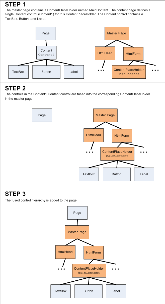 Figure 1 illustrates this fusion. Step 1 in Figure 1 shows the initial content and master page control hierarchies. At the tail end of the PreInit stage the Content controls in the page are added to the corresponding ContentPlaceHolders in the master page (Step 2). After this fusion, the master page serves as the root of the fused control hierarchy. This fused control hierarchy is then added to the page to produce the finalized control hierarchy (Step 3). The net result is that the page’s control hierarchy includes the fused control hierarchy.