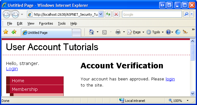 The bulk of the above code verifies that the UserId supplied through the querystring exists, that it is a valid Guid value, and that it references an existing user account. If all of these checks pass, the user account is approved; otherwise, a suitable status message is displayed.