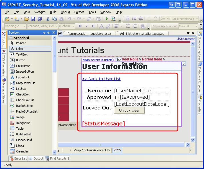 ManageUsers.aspxpage already contains a set of “Manage” links and theUserInformation.aspxpage provides an interface for changing the selected user’s password. I decided not to replicate that functionality in the code associated with this tutorial because it worked by circumventing the Membership API and operating directly with the SQL Server database to change a user’s password. This tutorial starts from scratch with theUserInformation.aspxpage.
