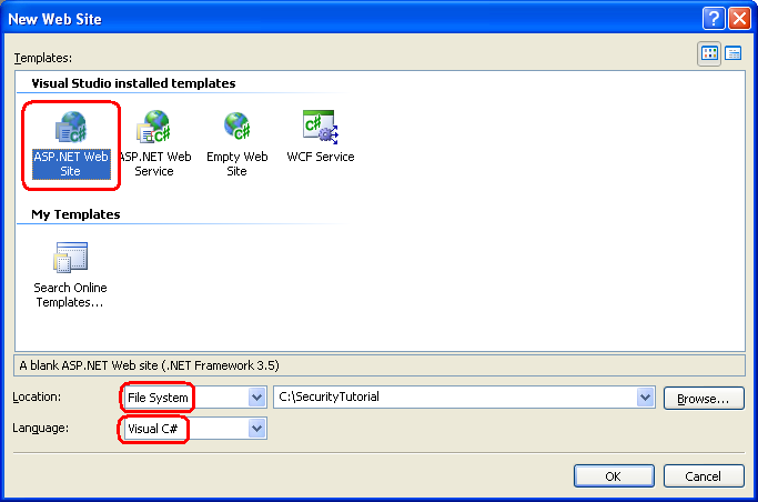 Before we can configure forms authentication, we first need an ASP.NET website. Start by creating a new file system-based ASP.NET website. To accomplish this, launch Visual Web Developer and then go to the File menu and choose New Web Site, displaying the New Web Site dialog box. Choose the ASP.NET Web Site template, set the Location drop-down list to File System, choose a folder to place the web site, and set the language to C#. This will create a new web site with a Default.aspx ASP.NET page, an App_Data folder, and a Web.config file.