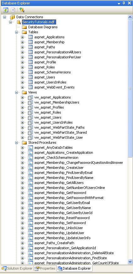 Adding a database to the App_Data folder automatically includes it in the Database Explorer view. (In the non-Express Edition version of Visual Studio, the Database Explorer is called the Server Explorer.) Go to the Database Explorer and expand the just-added SecurityTutorials database. If you do not see the Database Explorer on screen, go to the View menu and choose Database Explorer, or hit Ctrl+Alt+S. As Figure 2 shows, the SecurityTutorials database is empty - it contains no tables, no views, and no stored procedures.