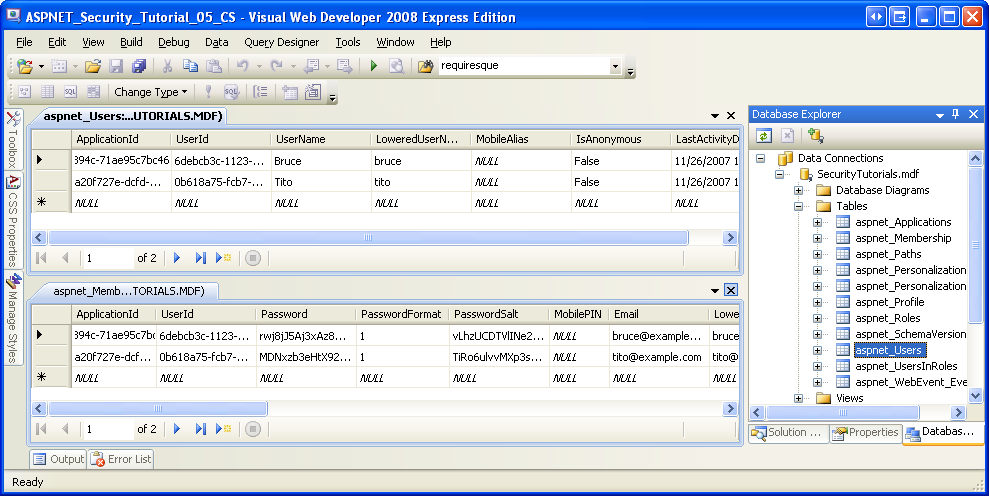 After creating a few user accounts, verify that the accounts have been created by listing the contents of the aspnet_Users and aspnet_Membership tables in the SecurityTutorials.mdf database. As Figure 10 shows, I have added two users via the CreatingUserAccounts.aspx page: Tito and Bruce.
