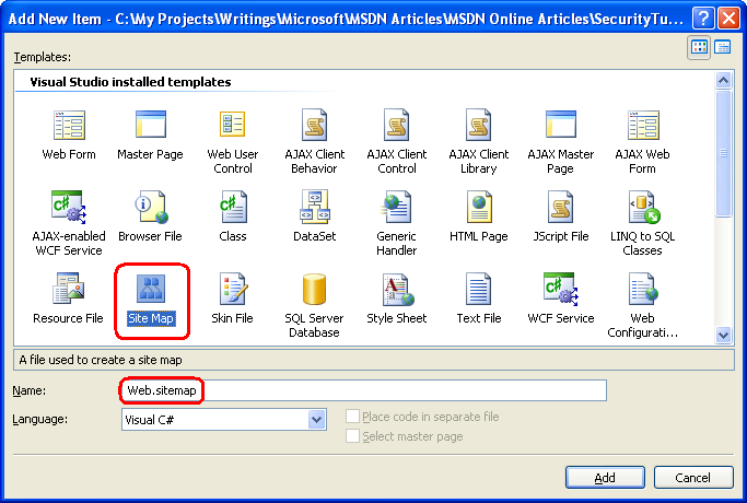 The default Site Map provider expects a properly-formatted XML file named Web.sitemap to exist the root directory. Since we are using this default provider, we need to add such a file and define the site map’s structure in the appropriate XML format. To add the file, right-click on the project name in Solution Explorer and choose Add New Item. From the dialog box, opt to add a file of type Site Map named Web.sitemap.