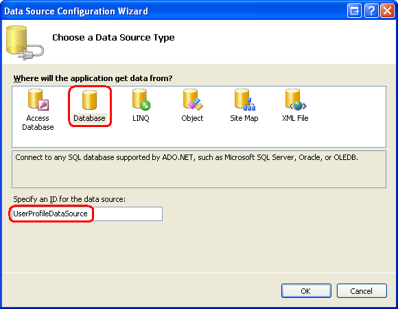 Open the AdditionalUserInfo.aspx page in the Membership folder and add a DetailsView control to the page, setting its ID property to UserProfile and clearing out its Width and Height properties. Expand the DetailsView’s Smart Tag and choose to bind it to a new data source control. This will launch the DataSource Configuration Wizard (see Figure 7). The first step asks you to specify the data source type. Since we are going to connect directly to the SecurityTutorials database, choose the Database icon, specifying the ID as UserProfileDataSource.