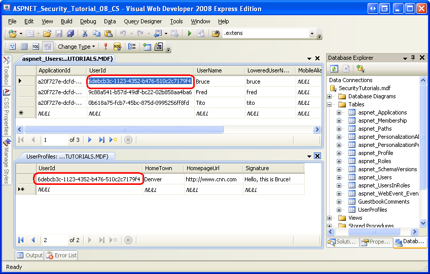 Figure 11: The Contents of the aspnet_Users and UserProfiles Tables are Displayed (Click to view full-size image)