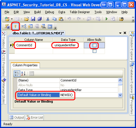 Next, define the GuestbookComments’s columns. Start by adding a column named CommentId of type uniqueidentifier. This column will uniquely identify each comment in the guestbook, so disallow NULL s and mark it as the table’s primary key. Rather than providing a value for the CommentId field on each INSERT, we can indicate that a new uniqueidentifier value should be automatically generated for this field on INSERT by setting the column’s default value to NEWID(). After adding this first field, marking it as the primary key, and settings its default value, your screen should look similar to the screen shot shown in Figure 2.