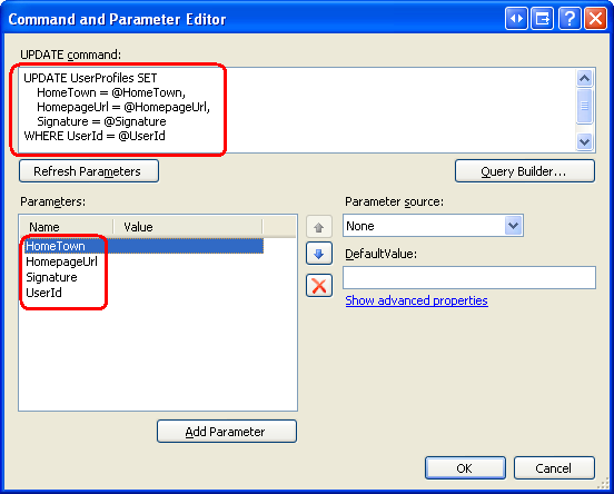 15: SelectCommand="SELECT [UserId], [HomeTown], [HomepageUrl], [Signature] FROM