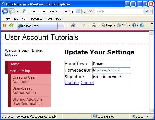 There are a variety of ways to allow the currently logged on user to view and edit his home town, homepage, and signature information. We could manually create the user interface with TextBox and Label controls or we could use one of the data Web controls, such as the DetailsView control. To perform the database SELECT and UPDATE statements we could write ADO.NET code in our page’s code-behind class or, alternatively, employ a declarative approach with the SqlDataSource. Ideally our application would contain a tiered architecture, which we could either invoke programmatically from the page’s code-behind class or declaratively via the ObjectDataSource control.