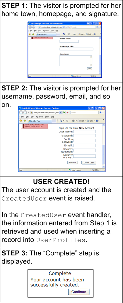 Go ahead and visit this page through a browser and create a new user account, specifying values for the home town, homepage, and signature. After completing the CreateUserWizardStep the user account is created in the Membership framework and the CreatedUser event handler runs, which adds a new row to UserProfiles, but with a database NULL value for HomeTown, HomepageUrl, and Signature. The values entered for the home town, homepage, and signature are never used. The net result is a new user account with a UserProfiles record whose HomeTown, HomepageUrl, and Signature fields have yet to be specified.