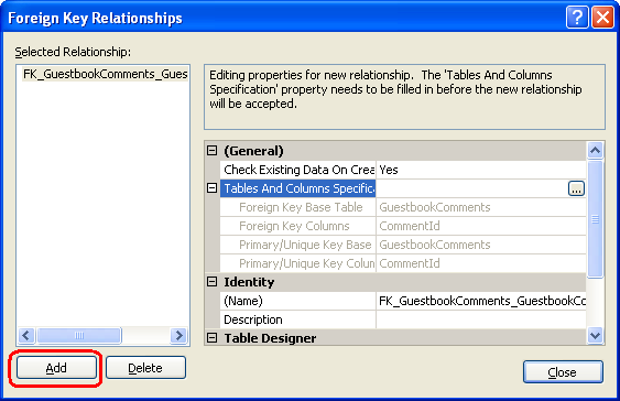 Click the Add button in the lower left corner of the Foreign Key Relationships dialog box. This will add a new foreign key constraint, although we still need to define the tables that participate in the relationship.